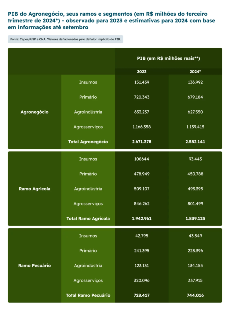 Com base no desempenho dos ramos e segmentos do agronegócio ao longo dos três primeiros trimestres de 2024, a projeção indica que o PIB do setor pode alcançar R$ 2,58 trilhões no ano, sendo R$ 1,84 trilhão do ramo agrícola e R$ 744,02 bilhões do ramo pecuário, considerando os preços do terceiro trimestre de 2024.