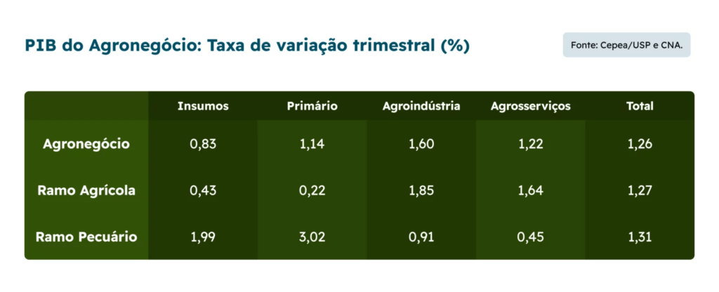 - Ramo agrícola: o PIB cresceu 1,85% na agroindústria e 1,64% nos agrosserviços, enquanto o avanço foi mais moderado nos insumos (0,43%) e no setor primário (0,22%).