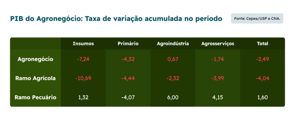 Por fim, os agrosserviços registraram retração de 1,74%, impactados pela queda de 3,99% nos serviços agrícolas, enquanto os serviços pecuários avançaram 4,15%, sustentados pela maior produção prevista no setor.
