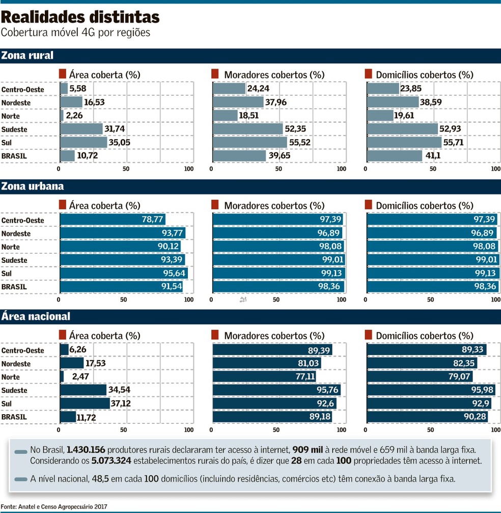 A revolução tecnológica chegou ao campo brasileiro, mas está longe de ser para todos. Enquanto nas zonas urbanas do país 91,5% da área total tem cobertura para conexão de celulares à rede 4G, nas rurais o índice é de 10,72%, oque pressiona a média nacional para 11,7%, segundo dados da Agência Nacional de Telecomunicações (Anatel).Ligados ao mundo somente com dispositivos móveis, e ainda com dificuldade de sinal nas fazendas, boa parte do sprodutores pouco consegue aproveitar a onda de inovações criadas para melhorar sua atividade.