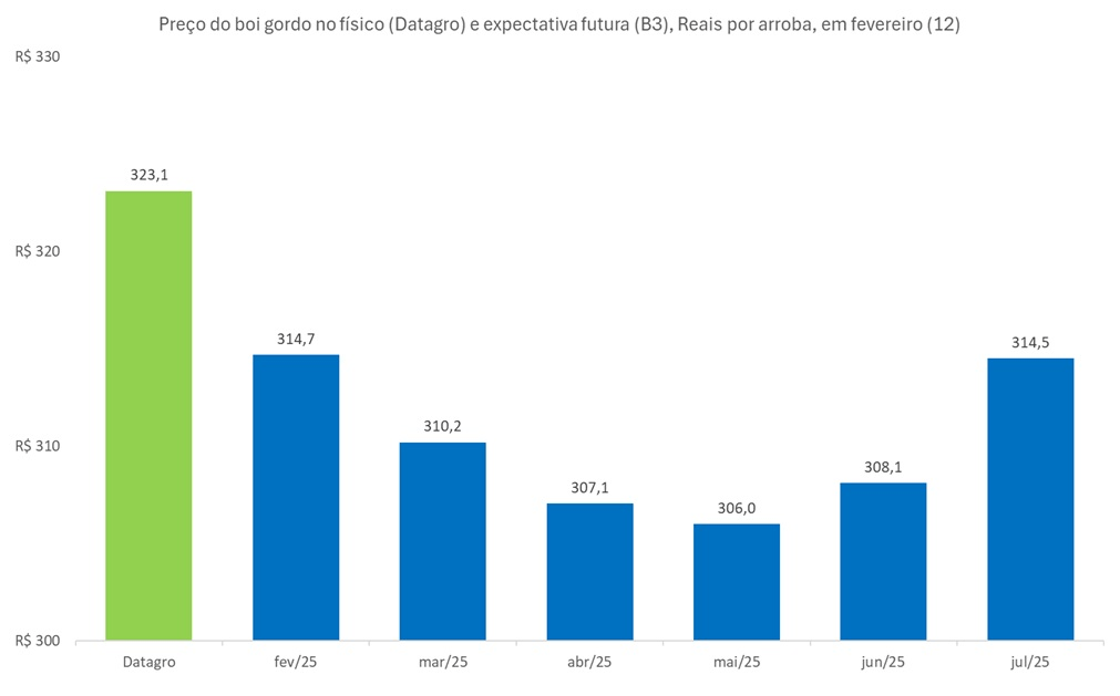 A Figura abaixo apresenta dados de preço do boi gordo no mercado físico (Datagro) e dos contratos futuros, segundo B3, entre fevereiro e julho de 2025, em Reais por arroba, no dia 12 de fevereiro, considerando os valores do after-market.